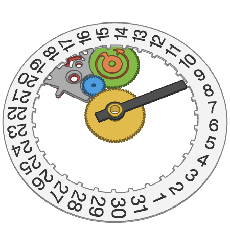 Bizim mekanizmamızda, saniye ibresi güç aktarma sisteminin dördüncü tekerleğine monte edilmiştir çünkü bu çark dakikada bir kez yüksek hassasiyetle dönmektedir. Yelkovanın doğru hızda dönebilmesi için bir eksenin bundan 60 kat daha yavaş dönmesi gerekiyor. Neyse ki, bu saat mekanizmasının tasarımcıları diğer viteslerden kaynaklanan hız düşüşünün bir kısmından faydalanmak için ustaca bir yöntem kullanmışlar. Saatin merkezine, tahrik çarkıyla birlikte bir top dişlisi monte edebilir ve bu tahrik çarkının küçük dişliyle birbirine geçmesini sağlayabiliriz. Üçüncü tekerlek döndüğünde, tahrik tekerleğini ve dolayısıyla top pinyonunu da döndürür. Yelkovanı top pinyonunun üzerine monte ederek geçen dakikaları takip edebiliriz; ilgili tüm dişlilerdeki diş sayısı, saniye ibresine kıyasla istenen 60 kat hız düşüşünü elde etmek için dikkatlice hesaplanır. Akrebin dakika ibresinden 12 kat daha yavaş dönmesi gerekir, ancak bunu iki ek vites kullanarak kolayca başarabiliriz. Ara dakika çarkı top pinyonuyla, saat çarkı da o dakika çarkının pinyonuyla birbirine geçer. Saat çarkı, top dişlisi üzerinde gevşek bir şekilde dönebilir, böylece her ikisi de birbirinden bağımsız olarak dönebilir. Akrebi o saat çarkının üzerine koyarak saatin ibrelerini hareket ettiren mekanizmanın montajını bitirebiliriz. Ayrıca on iki saatin her birinin işaretlendiği bir kadran da ekledim; bu aslında ibrelerin gösterdiği zamanı okumamızı sağlıyor. Zaman tutmak her saatin temel işlevidir, ancak çoğu cihaz komplikasyon olarak bilinen çeşitli ek özellikler ekleyerek bunun ötesine geçer. Mekanizmamız çok karmaşık olmasa da yine de kadranın sağ tarafındaki küçük pencerede ayın o anki gününü gösteren hoş bir komplikasyona sahiptir. Tarih Bu saatteki tarih mekanizması dört ana parçadan oluşur: atlama yayı, gösterge dişlisi, tarih atlama plakası ve dişlisi ve üzerinde olası 31 günün yazılı olduğu büyük tarih halkası.Bu mekanizmanın nasıl çalıştığını açıklamak için öncelikle ilgisiz tüm parçaları gizleyeceğim. Ayrıca gösterge dişlisinin kapağını da çıkaracağım, bu da içinde gizlenmiş küçük bir burulma yayını ortaya çıkarıyor. Saat çarkı döndüğünde bu parçaların birlikte nasıl çalıştığını görelim. Saat çarkı döndükçe tarih atlama plakasındaki dişliyi de döndürür. Bu dişlinin diğer tarafı ise gösterge dişlisini ve ona bağlı burulma yayını döndürür. O yay, tarih halkasının dişine takılıp esniyor ama bir noktada tarih halkasını ileri doğru itmeye başlıyor. Halka yeterince döndüğünde atlama yayı halkayı hızla bir sonraki konuma geçirir. İlk etapta neden bu karmaşık mekanizmaya ihtiyacımız olduğunu merak edebilirsiniz. Safça, tarih halkasının dönüşünü saat çarkının dönüşüne doğrudan bağlayabileceğimizi varsayabiliriz; tıpkı saat çarkını dakikalarla senkronize olarak, daha yavaş da olsa döndürdüğümüz gibi. Ne yazık ki bu, kadrandaki küçük pencerenin altında güncel tarihin sürekli olarak dönmesine neden olacak ve okumayı zorlaştıracaktır.