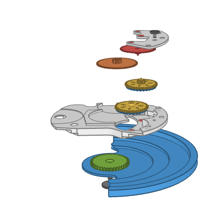 Mavi dişliyi saat yönünün tersine çevirdiğinizde, kolların sarı dişlinin iç kısmından kaydığını gözlemleyebilirsiniz. Ancak mavi dişliyi saat yönünde çevirdiğinizde, kollardan biri sıkışıyor ve bu durumda sarı dişliyi de döndürmeye başlıyor. Bu akıllı mekanizma, gücü mavi dişliden sarı dişliye yalnızca tek yönde aktarır. Otomatik sarma düzeneği, bu türden iki dişli içerir; biri saat yönünde döndürüldüğünde çıkış dişlisini çalıştırır, diğeri ise saat yönünün tersine döndürüldüğünde bu dişliyi döndürür. Sarı ve mavi dişlilerin çiftler halinde çalıştığını ve gücün doğrudan ağırlık dişlisinden çıkış dişlisine aktif olarak aktarıldığını vurgulamak istedim. Aynı anda yalnızca bir çift aktiftir; diğeri ya boşta döner ya da çıkış dişlisinin her zaman yayı sarmasını sağlamak için dönüş yönünü değiştirmek üzere bir ara madde görevi görür. Çıkış dişlisinin ağırlığa bağlı dişliye göre çok az döndüğüne dikkat edin, bu nedenle zemberek yayını tamamen sarmak için kolun çok fazla sallanması gerekir. Bununla birlikte, bir gün boyunca otomatik kurma mekanizması genellikle zembereğin kurulu kalmasını sağlar.