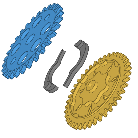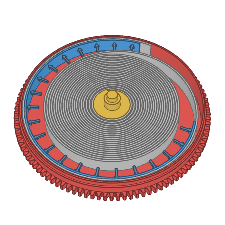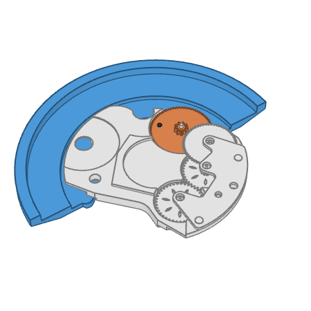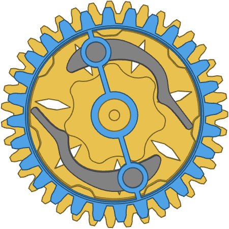 Saat takan bir kişi gün boyunca kollarını hareket ettirdiğinde, saatin uzaydaki yönelimi oldukça değişir. Hatta yavaş bir yürüyüş sırasında bile saat bir miktar sallanabilir. Normalde, saati çalıştırmak için harcanan enerjinin tamamı boşa gider, ancak otomatik kurma mekanizması bu enerjinin bir kısmını zembereği kurmak için kullanır otomatik kurma mekanizmasını anlamak için ilk olarak ana fikre odaklanalım. Ana parça, merkez etrafında serbestçe dönebilen bir ağırlıktır. Bu ağırlık döndüğünde, bir grup dişliyi çalıştırır ve en sonunda namlunun içinde saklı zemberek yayını sarmak için kullanılan mandallı çarka bağlanır. Ağırlığın serbestçe dönebilmesi kritik öneme sahiptir. Aşağıdaki gösteride, saati uzayda sürükleyerek döndürdüğünüzde ağırlığın nasıl tepki verdiğini görebilirsiniz. Yerçekimi, ağırlığı her zaman aşağı doğru çeker, böylece saatin geri kalanı göre dönmeyi sağlar. Saatin kurulmasıyla ilgili tartışmaları hatırlarsanız, cırcırlı tekerleğin yalnızca bir yönde dönebildiğini ve tıklamanın zemberek yayının kendi başına gevşemesini önlediğini anımsarsınız. Ancak ağırlık ileri geri hareket edebilir; bu da normalde ağırlığa bağlı herhangi bir dişli sisteminin her iki yönde de dönmesine neden olur. Otomatik kurma mekanizmasına tek başına baktığınızda, alışılmadık bir şey fark edebilirsiniz; ağırlığı ileri geri çevirdiğinizde çıkış dişlisi yalnızca bir yönde döner. Daha iyi anlamak için bu donanıma küçük bir siyah nokta ekledim. Bunun nasıl gerçekleştiğini anlamak için önce mekanizmada yer alan tüm parçalara bakalım Yeşil dişli, doğrudan ağırlığın altına takılıdır; böylece ağırlık döndüğünde bu dişli iki mavi dişliyi de döndürür. Bu kompozisyon, daha önce köprüler tarafından yerinde tutulan dişlilerle benzerdir. Ancak buradaki sır, iki çift sarı ve mavi dişliden gelir. Nasıl çalıştıklarını anlayalım Mavi dişli, sarı dişli üzerinde serbestçe dönebildiği gibi, balık benzeri kollar da mavi dişlideki delikler sayesinde kendi eksenleri etrafında dönebilir. Sarı dişlinin iç kısmının özel bir şekle sahip olduğuna dikkat edin. Aşağıdaki gösteride, içeride neler olduğunu görmek için mavi donanımın orta kısmının çoğunu çıkardım. Parçaların nasıl etkileşime girdiğini görmek için kaydırıcıyı kullanarak bu dişliyi ileri geri döndürebilirsiniz: Mavi dişliyi saat yönünün tersine çevirdiğinde kolların sarı dişlinin iç kısmına doğru hareket eder. görsellere dikkatlice bakınız.