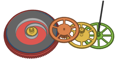 Mekanik bir saatteki dönen ibreleri göstermek istiyorsak, burulma yayı özellikle kullanışlıdır çünkü sağladığı dönme hareketi bu ibreleri hareket ettirir. Tipik bir mekanik saatteki yay biraz daha karmaşık bir şekle sahiptir; aşağıda rahat durumda görebilirsiniz. Kaydırıcıyı sürükleyerek havada sarmayı deneyebilirsiniz, ancak bıraktığınızda orijinal şekline geri dönecektir yay oldukça güçlü ve hızlı bir şekilde genişlemeye eğilimlidir. Yayı muhafaza etmek için onu namlu olarak bilinen bir muhfazaya konulmuştur. muhafazaya yerleştikten sonra yay hala orijinal durumuna genişlemeye çalışır, ancak namlunun duvarları onu yerinde tutar. Bu yay, saatin enerji deposudur ve adı olan “zemberek” olarak bilinir.