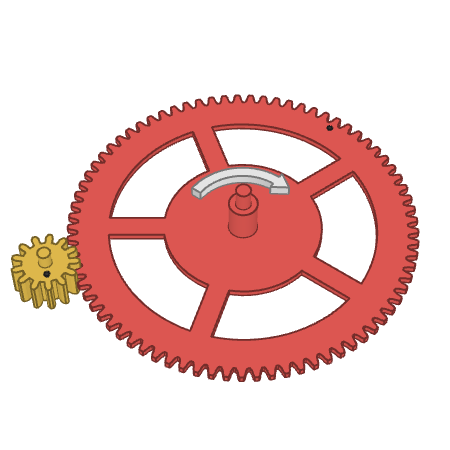 Şekilde bir büyük kırmızı dişlinin üzerine yerleştirilmiş küçük sarı dişlinin tek bir dönüşünü tamamlaması daha kısa sürer çünkü sarı dişli daha az dişe sahiptir.